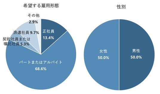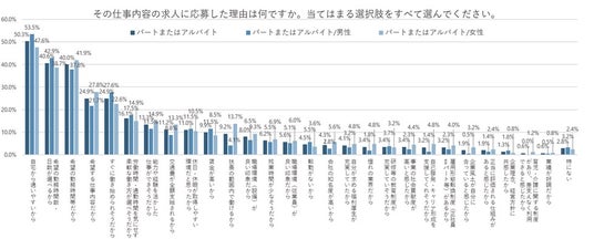 一方、「女性」のほうが「男性」よりも「扶養の範囲内で働けるから」が9.6pt、「希望する仕事内容だから」が6.1pt高くなった。収入に制限がある範囲での仕事探しや、仕事内容を男性以上に重視しているところは、女性がパート・アルバイトを選んでいる理由とも共通している。
