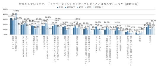 年代別にみると、「30代以下」では「キャリアアップのビジョンが見えない」「相談された問題を解決してあげられなかった」について全体と比べると意見が集まっており、仕事のモチベーションに負の影響があるようだ。問題解決には経験がより多い人からのサポートがあるとよいだろう。「50代」では「仕事内容に報酬が見合っていない」が他の年代より高くなった。この年代になるとマネジメントにも携わる人が多くなり、それまで感じてきた苦労とは別の大変さが増えたり、反対に仕事は同じでも役職が外れて賃金が下がることもあったりと、仕事と報酬面でのアンバランスさがより感じられ、報酬面での不満が高まりやすいのかもしれない。