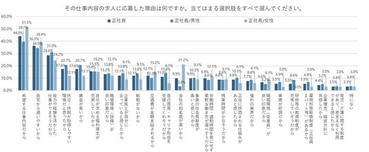 一方、「女性」のほうが「男性」よりも「会社の知名度が高いから」が17.8pt、「希望する仕事内容だから」が11.8pt高くなった。もともと自身が知っている企業であれば安心につながりやすく、応募しやすいのかもしれない。