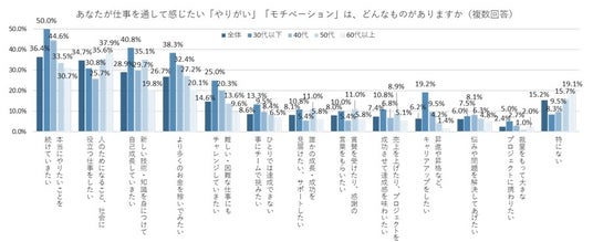 仕事で本当にやりたいことを続けていきたいとの回答が36.4%、年代が下がるほど割合増。仕事内容に報酬が見合っていないとモチベーションの低下につながる人は32.9%