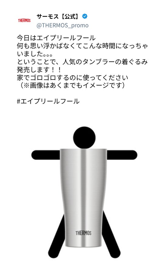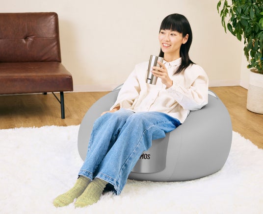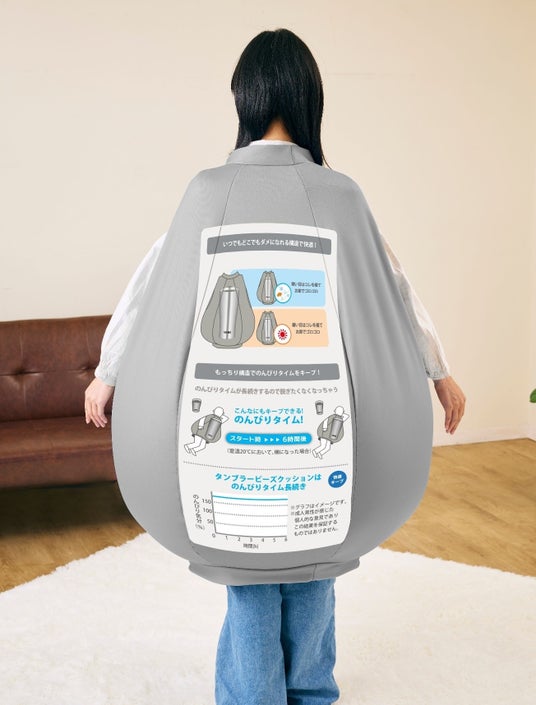 「着るタンブラー」ビーズクッションとは、2025年のエイプリルフールにサーモスの公式X(@THERMOS_promo)が投稿した内容から実現したアイテムです。魔法びんが持つ“温かさ”のイメージを生かし、着たまま座って自宅でゆったり過ごせるクッションに、温もりと親和性の高いタンブラーの柄をプリントしたデザインです。