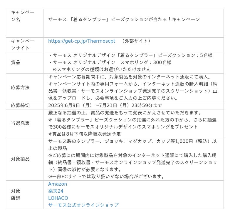 対象のECサイトにてサーモスのタンブラーやジョッキ、マグカップなどの対象製品をご購入の上、キャンペーンサイト内の専用フォームから、EC購入明細(納品書・領収書・サーモスオンラインショップ発送完了のスクリーンショット)画像をアップロードし、必要事項をご記入の上ご応募ください。「着るタンブラー」ビーズクッション(非売品)もしくはオリジナルスマホリング(非売品)が抽選で合計305名様に当たります。