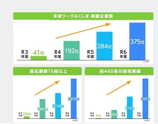 令和6年度の掲載企業数は375社、応募者数は5,859名、採用実績は392名と、事業開始から毎年、着実に増加しています。