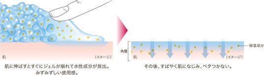 肌にのせるとすぐにジェルが崩れてなじみ、みずみずしい使用感で、べたつかない。