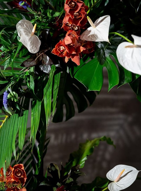 熱帯雨林のジャングルのように、ダイナミックで生命力を感じるコーディネート。フォルムが特徴的な熱帯系の花、モンステラ、アレカヤシなどの葉の形が印象的なグリーンを合わせて、植物本来の姿かたちを存分に楽しんで。自然の持つパワーで心が洗われるような癒しの空間を提供します。