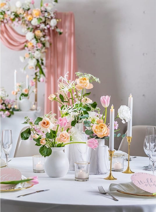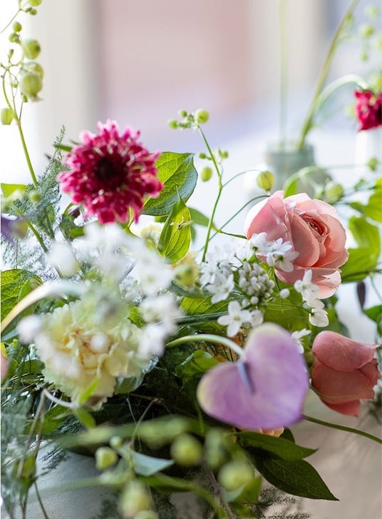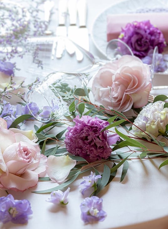 ピンクをメインカラーにした柔らかな色合いがロマンティックなコーディネート。甘く優しい雰囲気の花々が幸福感に包まれた笑顔あふれる空間を演出します。丸みがあり柔らかな花びらをもつ花をメインに、ホワイトを加えるとより明るくソフトな雰囲気に。ライトグリーンの葉物やパープルを合わせて甘すぎずヘルシーな印象に仕上げるのもおすすめです。