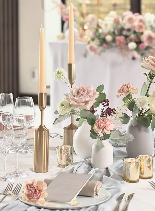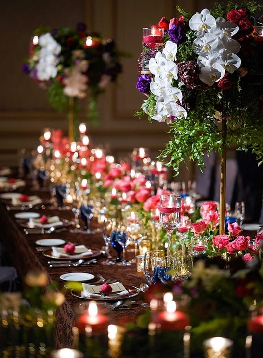 深紅やパープルの花々にゴールドのマテリアルを組み合わせると、はっと目を惹く華やかなコーディネートが完成します。たくさんのキャンドルがキラキラと輝く景色は、まるで映画のワンシーンのよう。参加するゲストにとっても一生心に残るドラマティックな空間で、最高のおもてなしを提供します。