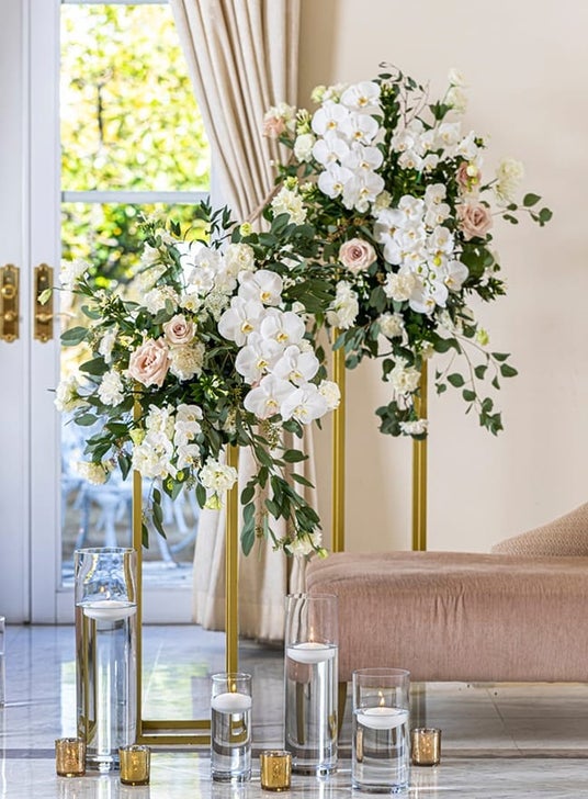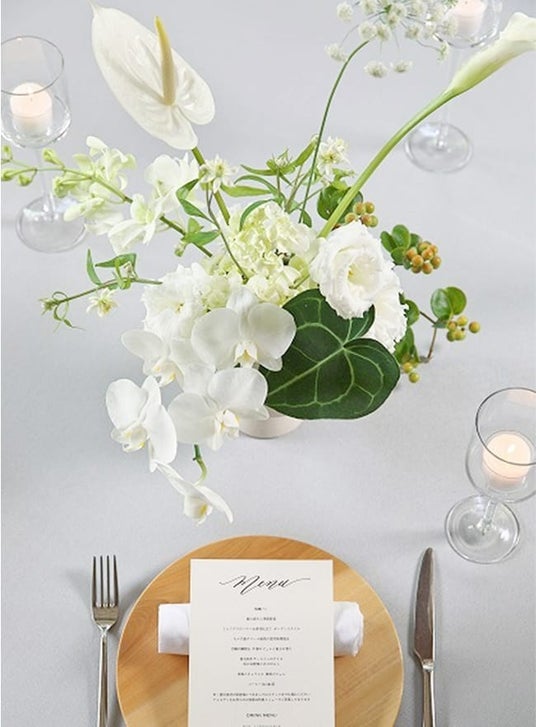 純白の大輪の花にゴールドを合わせた、王道で美しい華やかなスタイルです。ネイビーのテーブルクロスと合わせるとさらにロイヤル感を表現できおすすめです。ボルドーなどの深みのある色合いを組み合わせると、よりシックで落ち着いた印象を演出できます。キャンドルがきらめく特別な空間で、落ち着いてお料理を楽しむ大人のためのコーディネートです。