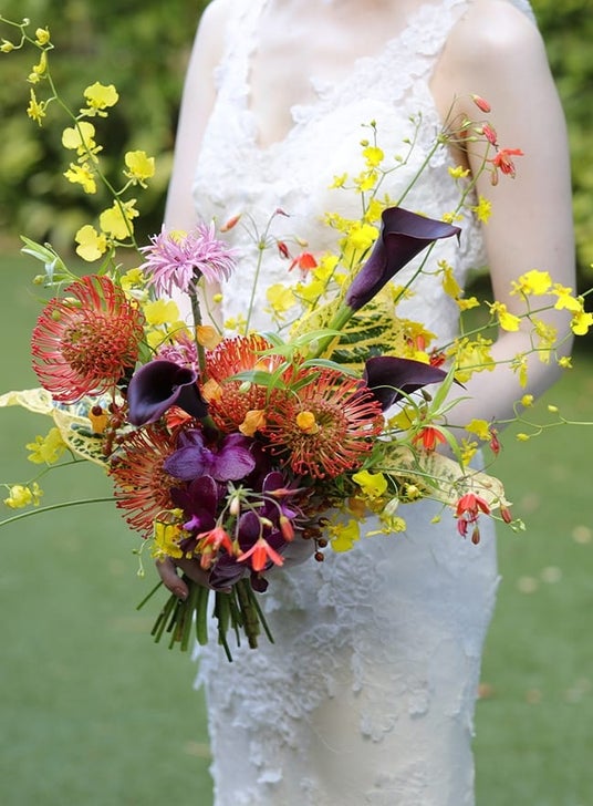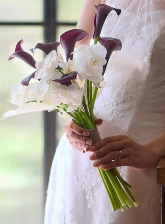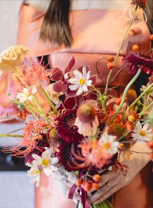 ほどよいカジュアルさと華やかさのバランスが絶妙な、こなれ感のあるおしゃれなスタイルです。配色はオレンジにボルドー・ブラウンなど、こっくりとした深みのあるものでまとめると暖かい雰囲気を表現できます。大輪で存在感のある花と、動きの出る花を組み合わせて軽やかに仕上げるのがトレンド。