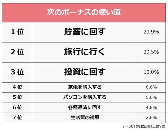 働いている501人に「次のボーナスの使い道」を聞いたところ、1位は「貯蓄に回す(29.9%)」、僅差の2位は「旅行に行く(29.5%)」でした。3位には「投資に回す(10.0%)」がランクインしています。