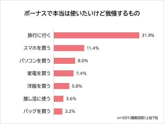 「次のボーナスで本当は使いたいけど我慢するもの」と聞いたところ、ダントツは「旅行に行く(31.9%)」でした。2位「スマホを買う(11.4%)」、3位「パソコンを買う(8.0%)」が続きます。