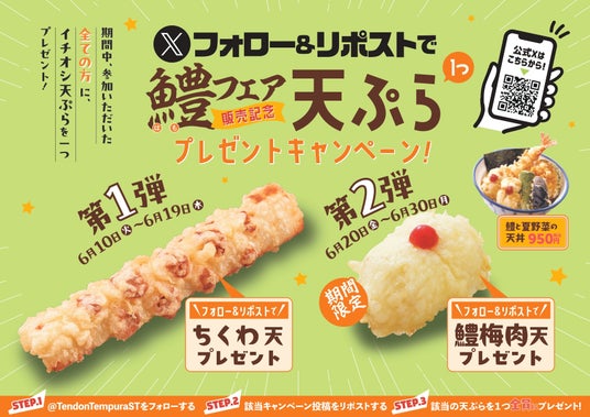 公式Xアカウントをフォローし、キャンペーン投稿をリポストすることで、第一弾の6月10日(火)~6月19日(木)までは食べ応え抜群な「ちくわ天」を、第二弾の6月20日(金)~6月30日(月)までは旬の天ぷら「鱧(はも)梅肉」が応募者全員その場でもらえます。
