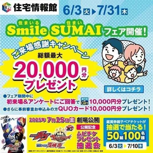 そんな住宅情報館では「Smile SUMAIフェア」を開催中。フェアに合わせてこの夏注目の映画『仮面ライダーガヴ&ナンバーワン戦隊ゴジュウジャー Wヒーロー夏映画2025』との公開記念コラボキャンペーン企画を実施しています。