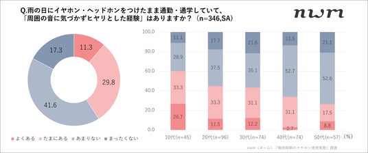 調査の結果、5割強が「雨の日にイヤホンをつけたまま通勤・通学をすることがある」と回答しており、10代は約8割、20代は約7割と、若い世代ほど使用率が高いことが分かりました。また、周囲の音が聞こえないことで「ヒヤリ」とした経験がある人は4割に上りました。下記詳細をご報告いたします。