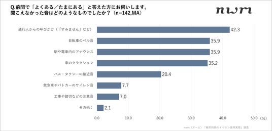 聞こえない音、「通行人からの呼びかけ」、「自転車のベル音」、「駅や電車内のアナウンス」が上位。