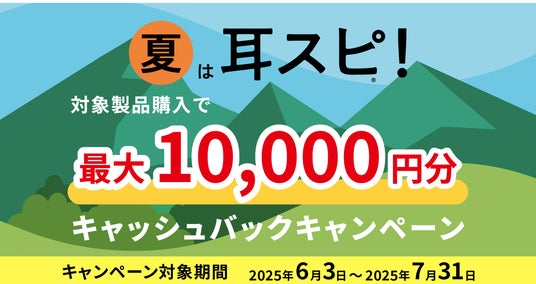 「夏は耳スピ!キャッシュバックキャンペーン」対象製品を期間中にご購入・ご応募いただいた方に抽選で33人に1人、10,000円分をキャッシュバックいたします。抽選にはずれても、製品に応じた金額を全員にキャッシュバックいたします。