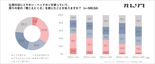 続いて、「雨の日にイヤホン・ヘッドホンを使用していて、周りの音の“聞こえにくさ”を感じたことがありますか?」という問いには、全体の34.2%が「感じる」と回答。こちらも10代では53.7%と、他の年代に比べて際立って高い結果となりました。