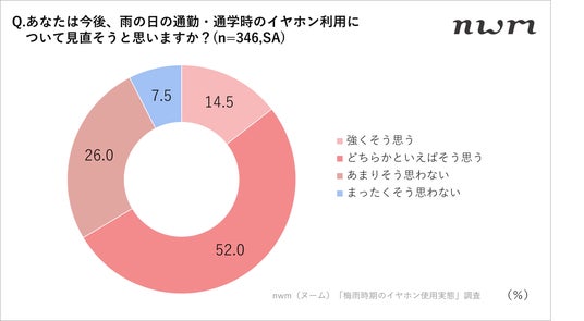 そのような中、「雨の日のイヤホン・ヘッドホン利用について見直そうと思いますか?」という問いに対しては、66.5%が「そう思う」と回答しており、安全面への関心の高さがうかがえます。