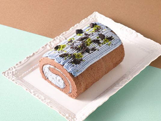 ふわふわのココアスポンジの中に、那須のジャージー牛乳入りのチョコミントクリームをたっぷり入れて巻きました。仕上げにもチョコミントクリームをたっぷりと絞り、アクセントにココアクッキーとピスタチオをトッピング。