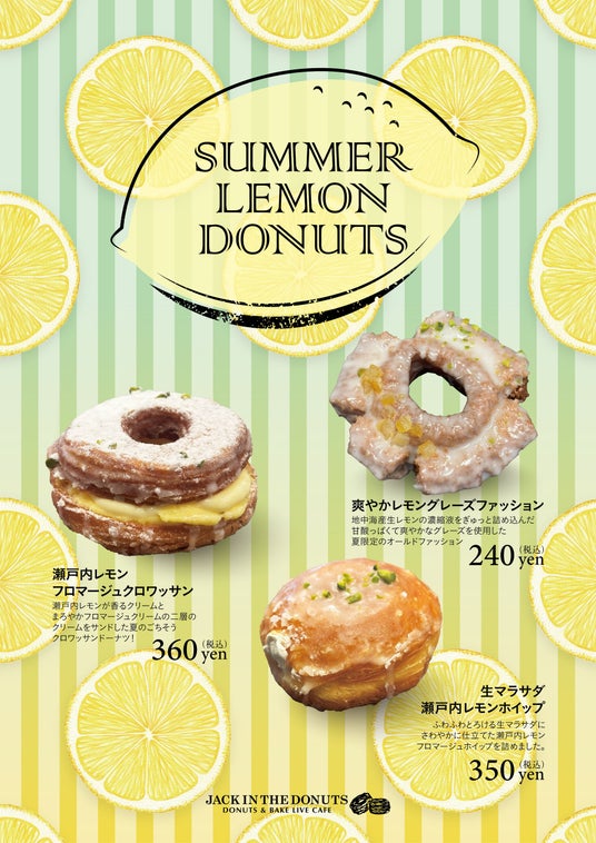 この度、『JACK IN THE DONUTS』の全店で、夏にピッタリなレモンが主役のドーナツ3種を6月26日(木)より期間限定で販売いたします。