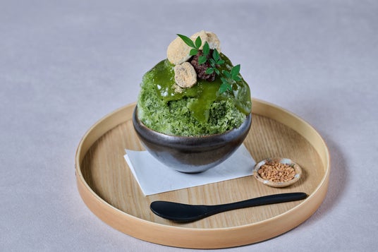 コク深く甘みと旨みの強い八女抹茶を贅沢に使用したかき氷。とろりとした抹茶のわらび餅ソースと自家製餡子に、サクサクとした黒胡麻きな粉のメレンゲとカリッと香ばしい胡桃のきな粉キャラメリゼを合わせました。中には抹茶のパンナコッタを忍ばせています。別添えの香ばしい香りを感じる玄米あられをトッピングに、食べ進めるごとに食感や味わいの変化をお愉しみいただけます。