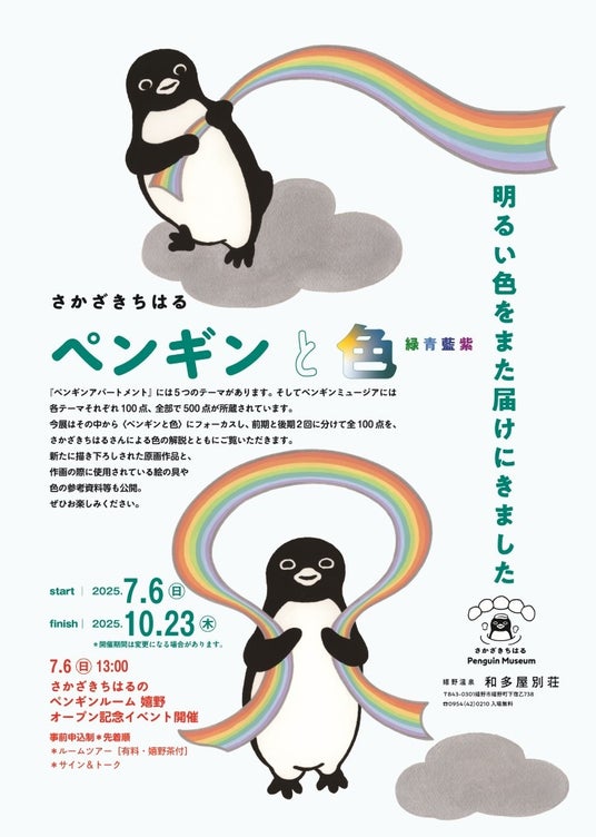 コンセプトルーム「ペンギンルーム 嬉野」のオープンを記念し、7月6日(日)に3つの特別イベントを開催します。さかざきさんが手がけた巨大壁画アートの初公開や、ファン必見のサイン&トーク、さらには七夕にちなんだ奉納イベントなど、ここでしか体験できない内容です。