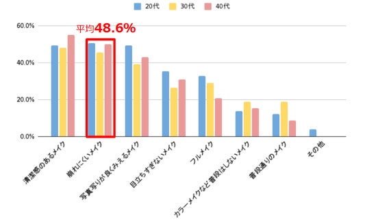 問5、問6どちらの回答でも、メイクの崩れにくさやキープ力を重視してメイクをしている方が多いことがわかりました。頻繁に離席することができない環境もあり、なるべくメイク直しをせず参列できる方が良いですよね。