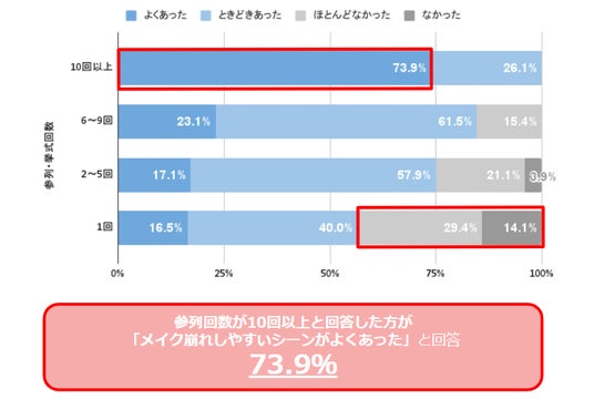 - 10回以上参列した方が「メイク崩れしやすいシーンがよくあった」と回答73.9%