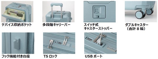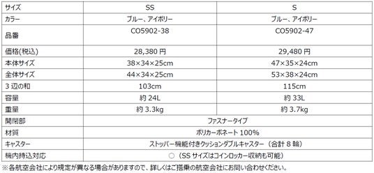 カラーはブルーとアイボリーの2色です。いずれも2サイズ展開で、コインロッカー収納サイズのSSサイズと、機内持ち込みサイズのSサイズ。価格はSSサイズが28,380円(税込)Sサイズが29,480円(税込)です。
