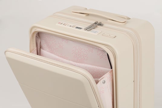 内装生地には、ことりっぷの表紙柄のデザインを使用しています。ブルーの内装には「ことりっぷ 清里八ヶ岳・南アルプス」の表紙である森と木と草をイメージしたデザインが、アイボリーには「ことりっぷ 東京」の花火と桜のデザインが施されています。“週末旅に出かけてリフレッシュしてほしい”、そして“スーツケースを開ける瞬間も豊かな自然を連想させる模様に癒されてほしい”という想いが込められています。