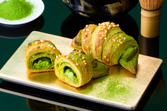 「プレミアムチョコクロ 京抹茶」は、祇園辻利の宇治抹茶を練り込んだ特別なクロワッサン生地を使用。祇園辻利の宇治抹茶を使用した濃厚な宇治抹茶チョコレートと宇治抹茶クリームを生地で包み込みしっとりと焼き上げており、噛むたびに香り高い宇治抹茶の風味と味わいを感じられるよう仕上げました。サクサクのクロワッサン生地との絶妙なコントラストもお楽しみいただけます。さらに仕上げにも宇治抹茶を振りかけており、まさに抹茶づくしな一品。トッピングのぶぶあられの食感や香ばしさもポイントです。