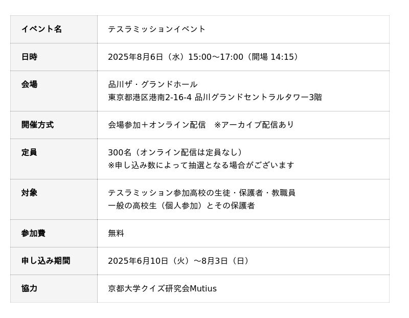 高校生・保護者向け「テスラミッションイベント」2025年6月10日(火)より申し込みを開始