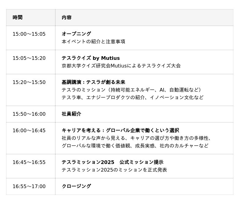 京都大学クイズ研究会Mutiusとの参加型クイズ、テスラによるプレゼンテーション、キャリアに関するセッションなど、複数の切り口からテスラを多面的に知るプログラムを展開。最後に「テスラミッション2025」参加者に向けた公式ミッションを発表します。