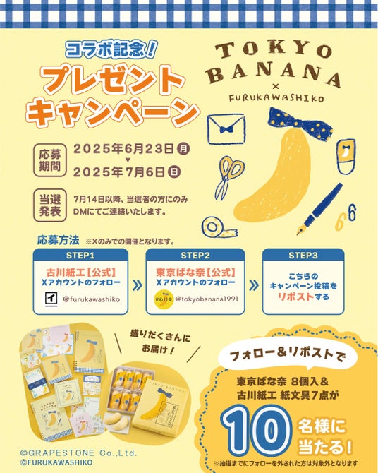 株式会社グレープストーン(本社:東京都中央区銀座、代表取締役社長:荻野強太)が展開する「東京ばな奈ワールド」 は、紙文具メーカーの古川紙工株式会社(本社:岐阜県美濃市、代表取締役社長:古川慎人、以下古川紙工)とのコラボレーションによる限定商品を、2025年6月26日(木)~6月29日(日)に開催される「文具女子博トーキョー」(会場:有明GYM-EX)にて販売いたします。