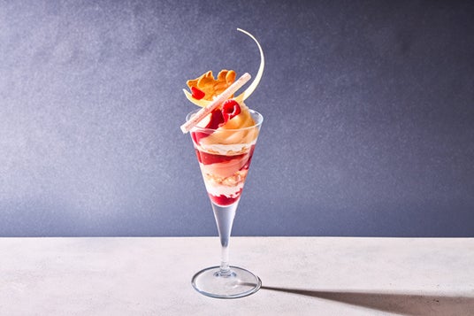 ピーチコンポートとバニラアイスクリームにアーモンドスライスとラズベリーソースを合わせた「ピーチメルバ」をパフェ仕立てにしました。ハイビスカス&ローズヒップ、白ワインで仕上げた2種のピーチコンポートが楽しめます。トップにはアーモンドチュイルとバニラアイスクリーム、ホワイトチョコレートを飾り、繊細な甘さの桃と甘酸っぱいフランボワーズの絶妙なハーモニーを味わえる一品です。※アルコール使用