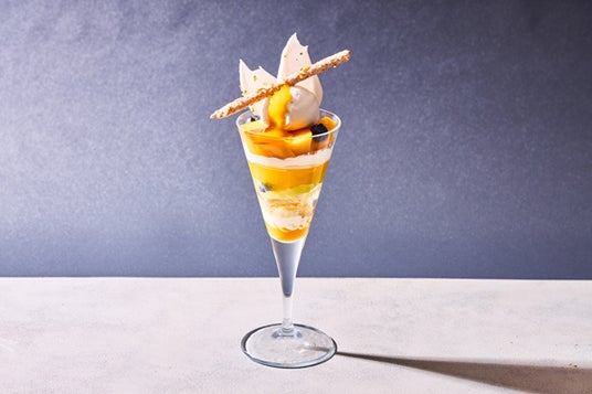 旬のフレッシュマンゴーに、クリームシャンティやマンゴーゼリー、ライムゼリー、マンゴーのコンポートを重ね、ココナッツアイスクリームと羽型のメレンゲバシュランをトッピングしたパフェです。さまざまな素材が織りなす食感と味わいが、ひと口ごとに変化し、最後まで飽きずに楽しめるトロピカルなデザートです。