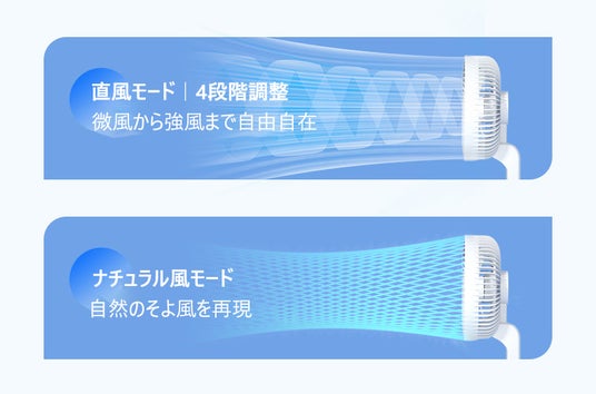 FDLAIは、「直風モード」と「ナチュラル風モード」の2タイプの風を搭載。 直風モードは、最大4段階の風量調整が可能。暑い日はしっかり涼しく、弱風にすればデスクワーク中にもぴったり。ナチュラル風モードは、自然のそよ風のように強弱のあるやさしい風を再現。長時間当たっても疲れにくく、就寝時にもおすすめです。