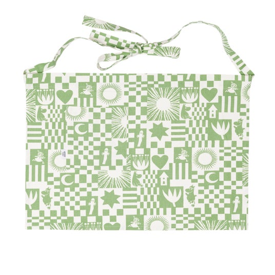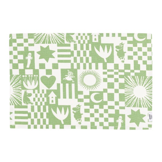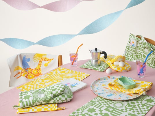 「パーティー コレクション」は、ムーミンとその仲間たちをカラフルな色彩で描き、遊び心あふれるレトロな雰囲気の幾何学模様を施しました。鮮やかな色彩のアイテムは、テーブルをまるで明るい太陽で照らし、色とりどりのお花があふれるように彩ります。明るいイエローとグリーンを基調に、ピンクとライトブルーがエッジを効かせ、果樹や花々、星、そしてプリマドンナの馬に乗るムーミントロールなど、全てが愛らしく活き活きとしています。トーベ・ヤンソンはもともと、1956年にストックマンデパートにて発売されたカーテンのためにこれらのイラストを描きました。今回、この明るく楽しい、そしてどこかレトロで懐かしい、この愛されるべきイラストが、テーブルやキッチンに寄り添う新しい「パーティー コレクション」としてリバイバルしました。