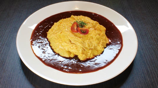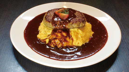香り豊かなガーリックバターライスを、ふんわりとした卵で包み、特製デミグラスソースでいただく一品。