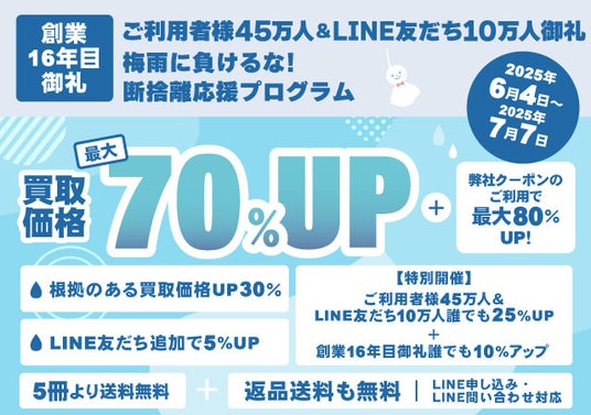梅雨に負けるな!お客様大感謝・大還元!断捨離応援スーパープログラム 買取価格最大70%アップ【ご利用者様45万人&LINE友だち10万人&創業16周年御礼企画】