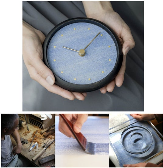 文字盤の下地は、岩絵具と相性の良い和紙。それも、金沢市の紙漉き職人・石川まゆみさんの手漉き和紙を贅沢に使用しています。時間を示すインデックスも、金沢の金箔を丸く打ち抜いたもの。本体は、漆器の産地として400年以上の歴史を持つ石川県加賀山中の「ろくろ引き」で木地を丸く削り出し、木目の美しさを生かしてしっとりとなめらかに仕上げています。加賀百万石の歴史と伝統が息づく、特別な逸品。