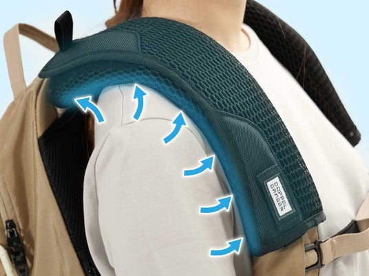 肩に風を。「肩パッド」リュックのショルダーストラップと肩の間に空冷層(通気層)を確保し、密着による蒸れや汗のベタつきを軽減します。