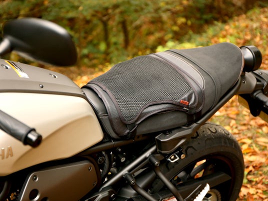 座面にも通気を。「シートパッド」オートバイのシートに取り付け、体とシートの間に空冷層を確保します。熱や湿気がこもらず、夏場でもサラッとした座り心地に。
