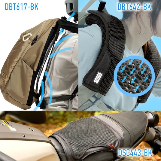 背中・肩の蒸れを軽減する「DBT643-BK 背中肩セットで蒸れんゾ」と、座面の蒸れを抑える「DSC443-BK バイク用シートクッションセット クール&ゲル」の要素をひとつにまとめ、ムレの根本原因に立ち向かいます。