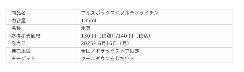 この度、「アイスボックス」をお客様に、より一層暑さ対策に役立てていただきたいという想いから、暑さ対策のアイテムとしてご活用いただけるよう、ドラッグストアルート限定で「アイスボックス<ソルティライチ>」を発売いたします。「アイスボックス<ソルティライチ>」は、汗をかいた身体にピッタリのさっぱりとしたソルティライチ味で、水分補給、クールダウンに加え、汗で失われる塩分を補給できる暑さ対策におススメの商品です。気温上昇という社会問題に対して、暑さ対策のアイテムとして「アイスボックス<ソルティライチ>を発売することで、あらゆる世代のウェルネスライフをサポートしてまいります。