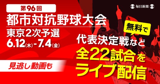 毎年夏に東京ドームで開催されるアマチュア野球の最高峰「第96回都市対抗野球大会」(毎日新聞社、日本野球連盟主催)。その出場権を賭けた東京都2次予選が6月12日(木)から7月4日(金)の日程で開催されます。毎日新聞社は、1回戦から代表決定戦までの全22試合を「毎日新聞デジタル」内の都市対抗野球公式サイトで無料ライブ配信します。社会人野球の頂点をかけた真剣勝負を、ぜひお楽しみください。