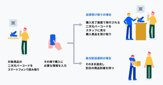 THE [ ] STOREは、SUPER STUDIOと三井不動産がEC/D2Cブランドへ提供するOMOソリューションのひとつです。来店者は自らのスマートフォンを使って二次元バーコードから商品を購入できます。出店するEC/D2Cブランドは、オンラインだけでなく、オフライン(リアル店舗)での購入データもecforceで一元管理できるようになるため分析がしやすく、顧客体験を向上するためのCRM施策などに活用できます。