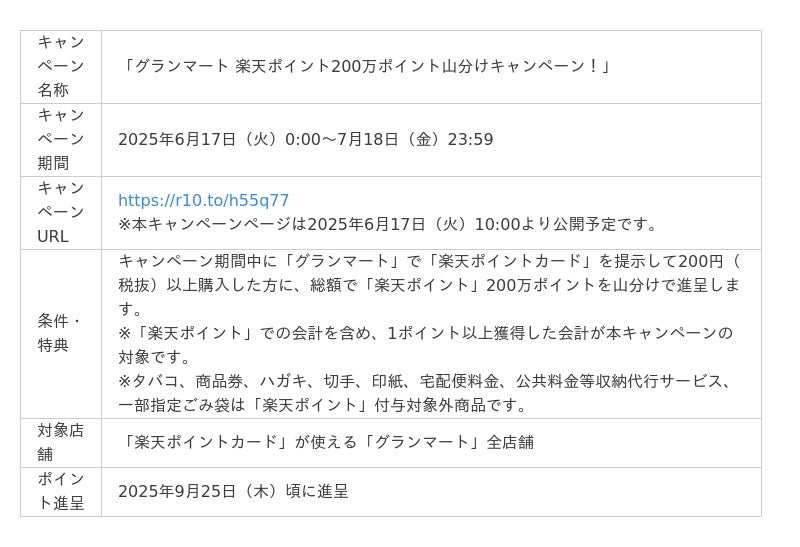 本導入を記念して、2025年6月17日(火)から7月18日(金)まで、「グランマート 楽天ポイント200万ポイント山分けキャンペーン!」を実施します。キャンペーン期間中に「グランマート」で「楽天ポイントカード」を提示して200円(税抜)以上購入すると、総額で「楽天ポイント」200万ポイントを山分けで進呈します。