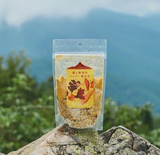 「Mountain Gourmet Lab.」鶏と舞茸のシェリー煮込み 1,980円 水とクッカーがあれば楽しめる、レストランクオリティーの山飯。舞茸の出汁と長州どりの旨味をシェリーの酸味が引き締める本格派の味。非常食としても頼れる一品。◎6月11日(水)~6月17日(火) ◎販売場所:コトコトステージ81