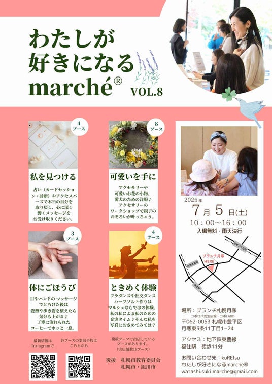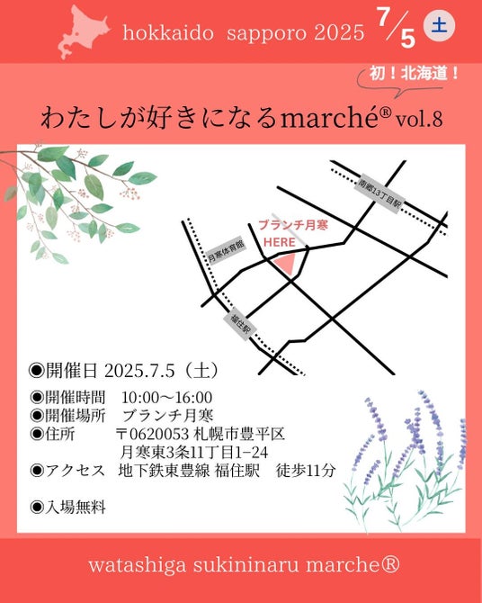 合同会社kuREIsu(本社:岡山県、代表:楠レイ)は、2025年7月5日(土)、札幌市豊平区の「BRANCH(ブランチ)札幌月寒」にて、「わたしが好きになるmarche(R) vol.8(北海道マルシェ)」を開催いたします。
